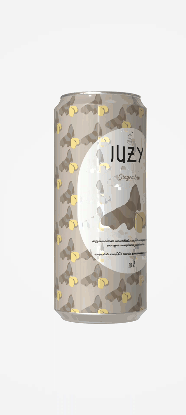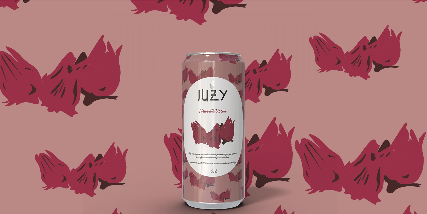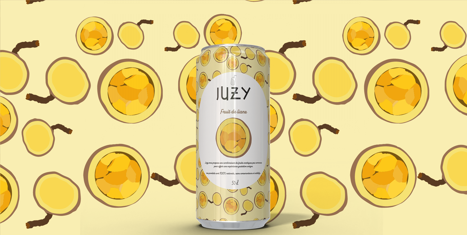 Le projet "Juzy", des packaging de jus exotique en cannette, est une idée fictive que j'ai développée au fil du temps, puis finalement adaptée visuellement.